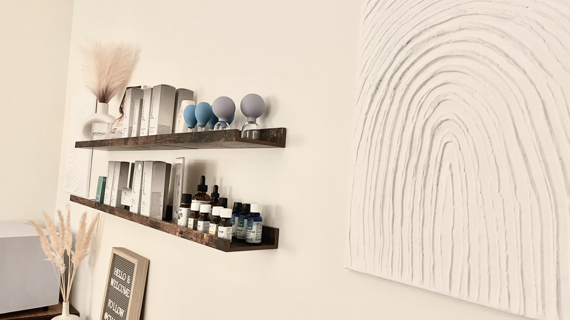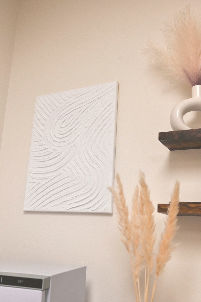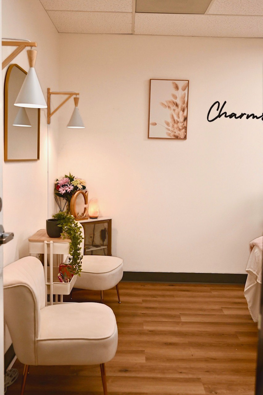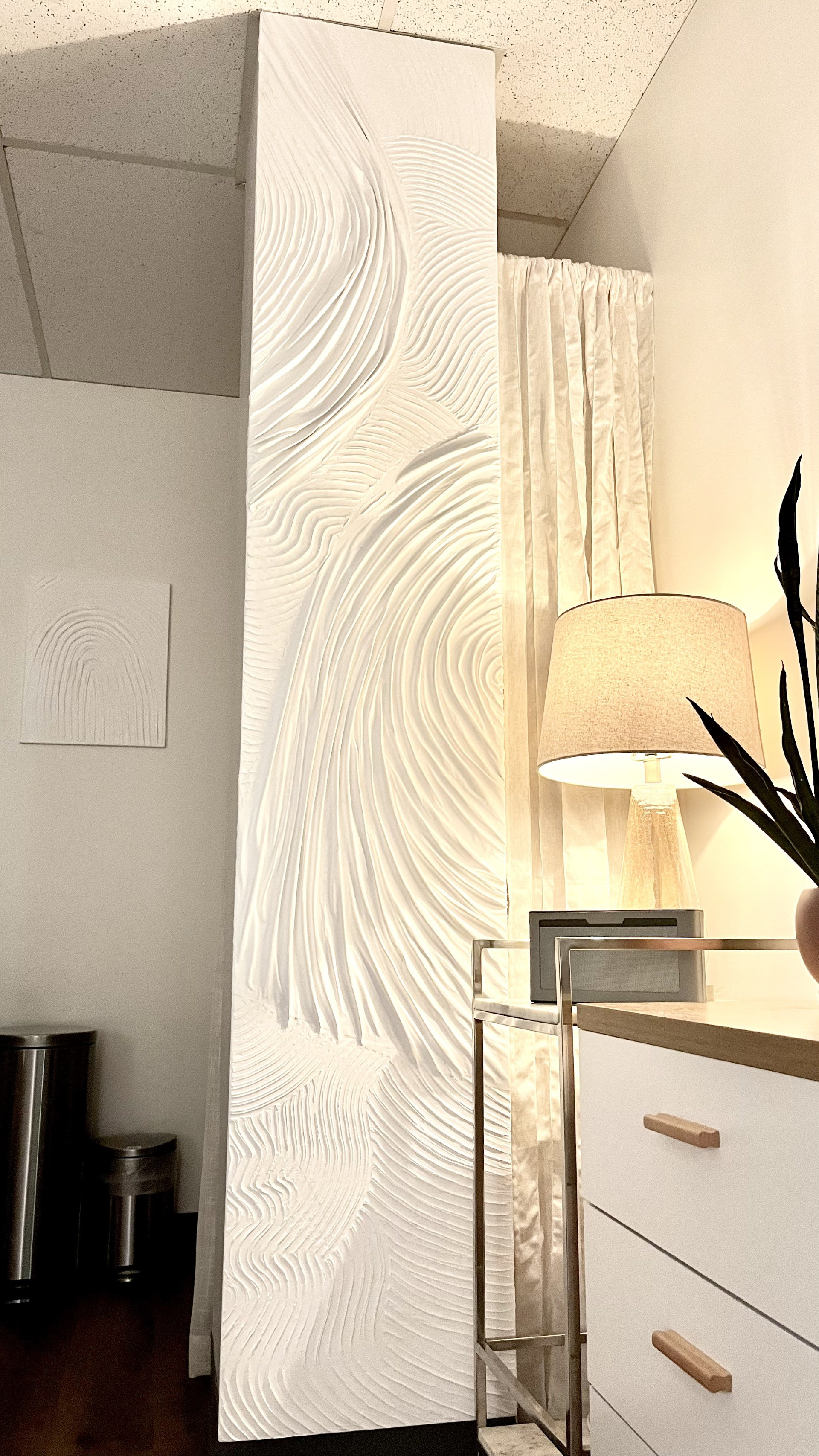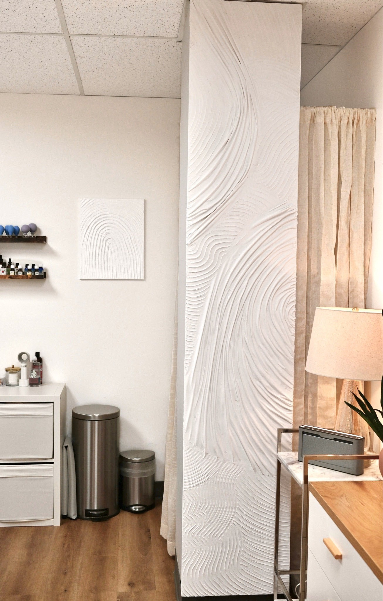 This COMMERCIAL project was a full redesign of a skincare studio inside a coworking building in Beaverton, OR. I handled layout, lighting, color palette, a mural, and custom artwork to enhance a warm and welcoming space. The client gave me creative freedom, so I experimented with different layouts and enjoyed making art for this space. A custom 8-foot 3D TEXTURED artwork hangs on a concrete pillar as a focal point, alongside a gallery wall featuring colorful pieces by local artist Sarah Kling (sarahandhareld). This project taught me patience, realizing THAT great design takes time. I had so much fun turning this vision into reality!